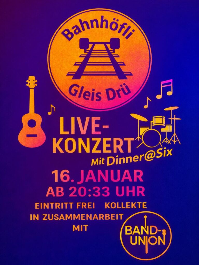 Das Gleis Drü wächst bewusst langsam. Statt dichtem Programm setzen die Gastgeber auf ausgewählte Abende, die Atmosphäre und Qualität verbinden. Wer hier hereinkommt, steht mitten im Geschehen, nah an der Bühne, umgeben von Musikfreunden, die zuhören und mitgehen. Die bisherigen Konzerte haben gezeigt, dass die Idee funktioniert: wenige Termine, dafür echte Live-Momente. Jetzt folgt der Energieschub für den Januar. Dinner@Six treten an, um Rockklassiker nicht zu verwalten, sondern neu aufleben zu lassen. Der Raum ist klein, die Wege kurz, die Konzentration hoch. Genau daraus entsteht die Spannung, die diese junge Reihe trägt: klare Auswahl, ehrliche Musik, direkter Kontakt.